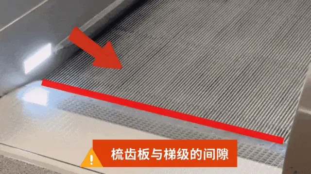 自動扶梯梳齒板與梯級、圍裙板與梯級、梯級與梯級的間隙,容易卷吸衣服裙擺或材質(zhì)柔軟的鞋子,請勿在這些區(qū)域站立或停留。